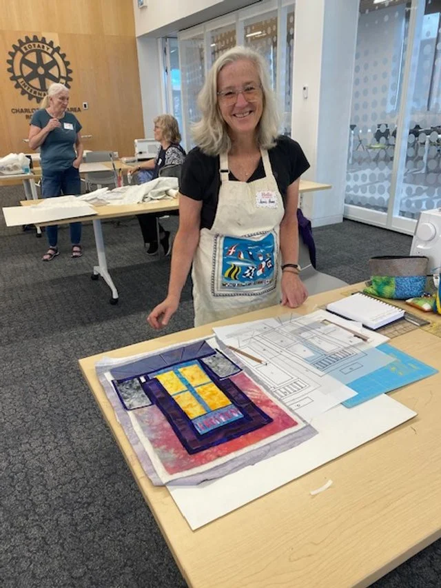 12 quilters arrived at 9:30 am to set up for the first workshop, a small quilt based on a doorway. Armed with freezer paper and steam a seam we learned a construction technique that outlines the main features with a thin dark line to create a more graphic image. By 5pm everyone had a fairly assemble project to take home, quilt and finish on their own time.